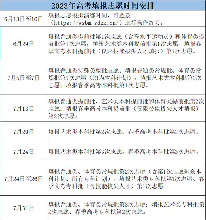 高考加油 迎/战/高/考 全/力/以/赴 考生注意啦! 山东省2023年夏季高考准考证打印时间为: 6月1日—6日每天9:00—20:00 6月7日—10日每天7:00—20:00 可登录山东省教育招生考试院普通高等学校招生考试信息平台(https://wsbm.sdzk.cn)自行打印准考证。 山东省2023年夏季高考时间表 考生须知 1.考生须凭准考证、有效居民身份证入场。 2.考生赴考点时,应准备好2B铅笔、书写用0.5mm黑色签字笔、橡皮等考试必需用品。 3.每科考前30分钟可以进入考场,对号入座,并将准考证、有效居民身份证摆放在课桌座号标签处。 4.所有科目开考15分钟后不得进入考点参加当次科目考试,考生不得提前交卷出场。 5.在考点封闭区入口和考场入口实行两次人工安检和一次智能安检。严禁携带手机等各种通讯工具、手表、电子存储记忆录放设备、发送接收设备、书包、学习资料、涂改液、修正带、计算器、计算尺等与考试无关的物品进入考点封闭区和考场。请考生将自己的物品妥善放置,以防丢失。 6.6月6日,考生可前往考点熟悉情况。具体按各市规定执行。 7.此证应妥善保存,正反两面在使用期间均不得涂改或书写,不得转让或顶替使用。被录取后,凭此证、入学通知书、身份证及招生高校规定的其他证件报到。 8.其他事宜请登录网站(https://www.sdzk.cn)查看《致我省2023年夏季高考考生的一封信》。 填报志愿 菏泽市曹州武术学校预祝广大考生金榜题名、前程似锦、高考加油~