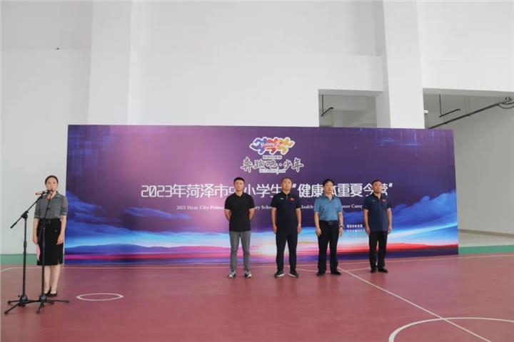 为进一步提升全市少年儿童身体素质和健康水平,引导社会、家长关注肥胖少儿群体,倡导健康生活方式,结合我市实际,菏泽市体育局从全市筛选了50名10—14岁的青少年,自8月13日至19日举行“健康体重夏令营”,并与今天上午9:30在曹州武校举行了开幕仪式。出席开幕式的领导有菏泽市体育局党组成员、副局长王奉勇同志,鲁西新区教育体育服务中心、教育体育工作办公室副主任郝登强同志,菏泽市曹州武术学校校长贾振东同志 ,菏泽市曹州武术学校副校长、本次“健康体重夏令营”营长祝全想同志。参加开幕式的还有全体营员、家长、教师、教练、工作人员及驻菏媒体记者。