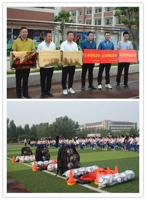 领导为三所学校授牌,菏泽市校园足球协会分别为三所学校赠送器材。