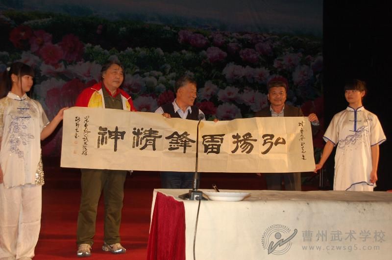 图为雷锋生前战友乔安山来我校做报告,贾馆长赠的书法作品